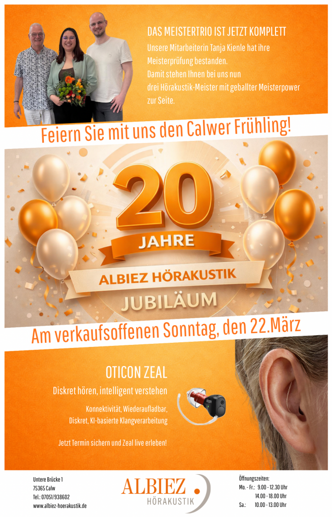 Albiez Hörakustik ist ein modernes, inhabergeführtes Hörgeräte-Fachgeschäft in Calw. Gegründet wurde das Unternehmen im März 2006 von Thomas Albiez.